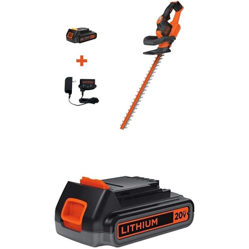 The BLACK+DECKER LHT321FF 20V MAX Lithium 22 inch Powercut Hedge Trimmer is ideal for tough hedges and shrubs. It is an agile cordless trimmer with POWERCUT; this Hedge Trimmer really goes the distance, trimming up to 3,000 sq. ft. in one charge. The ergonomic grips and low vibration help you go the distance in comfort. POWERCUT allows you to cut through a jam with the push of a button. A powerful 20V MAX lithium Ion battery delivers power and run time for most trimming jobs. It features a 22 in. dual action blade to ensure less vibration while trimming. This unit quickly cuts branches up to 3/4 in. diameter. Part of the 20V MAX System 1 System. Endless Tasks. Power for your Style. Maximum initial battery voltage (measured without a workload) is 20 volts. Nominal voltage is 18. This unit is packaged with Frustration Free Packaging. Includes: LHT320 20V MAX Lithium Powercut Hedge Trimmer, LBXR20 20V MAX Lithium Battery, LCS1620 charger.