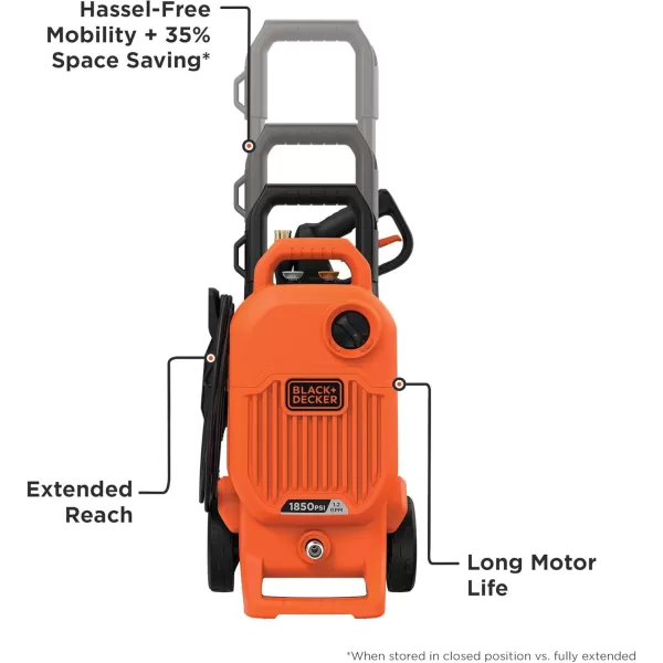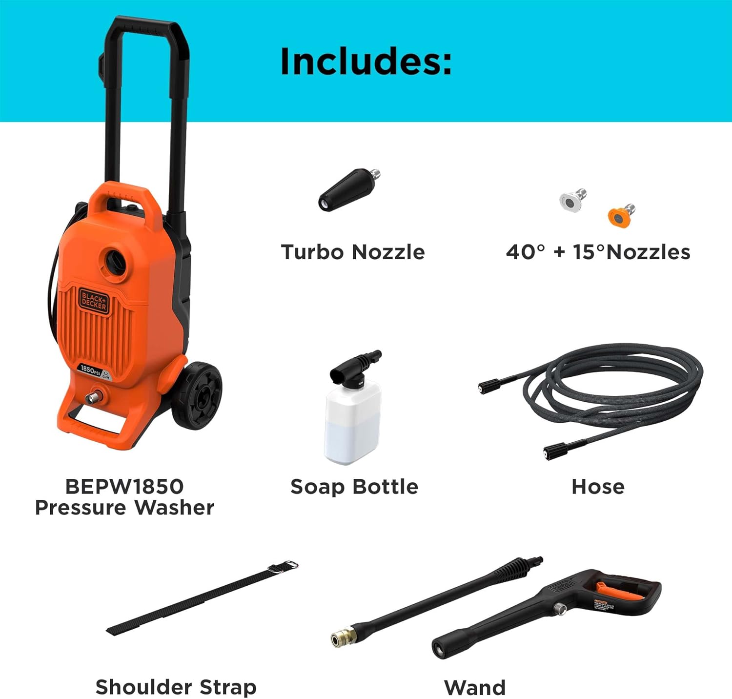 From cleaning your patio and siding to car washing, tackle outdoor cleaning chores with this 1,850 MAX psi* 1.2 gpm** Electric Cold Water Pressure Washer. Easy to maneuver and store with its telescoping handle and 6 in. wheels, the pressure washer saves up to 35% space when stored***. Stay organized with on-board storage for the hose, wand, power cord, turbo nozzle, 15 deg nozzle, and 40 deg nozzle. For pro-grade efficiency, the turbo nozzle delivers up to 145% more cleaning width. Achieve a high-level of clean by adding detergent to the included soap bottle. Designed to extend motor life, the pressure washer features an automatic shut-off function, activated when the trigger is released.